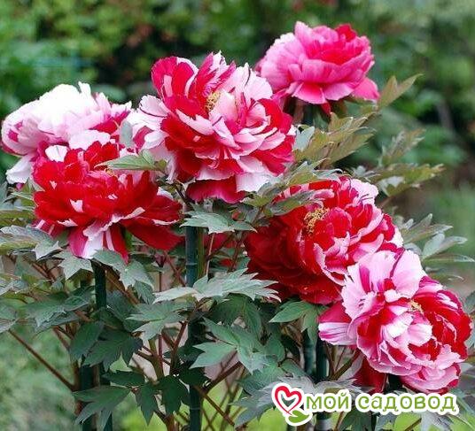 Кустарник высотой 1-1.5 м. Листья крупные ярко-зеленые. Цветет в средние сроки (начало-середина июня). Цветки крупные: 15-17 см, густомахровые, почти шаровидные. На одном растении могут быть совершенно разные по окраске цветки: бледно-розовые с малиновыми вкраплениями, розовые с белым, пурпурные, и другие сочетания этих окрасок. Цветение продолжительное: две недели и более. Лучше растет на солнце, но подойдет и легкая полутень. Розовидная форма. Окраска часто двухцветная: пурпурно-красный с розовым, либо белый с темно-фиолетовым вкраплением. Причем на одном кусте могут встречаться разные цветки. Прямостоячий кустарник с длинным жестким стволом, цветущий в середине сезона. Корень пиона привит на травянистый. Пион древовидный — морозоустойчивый кустарник, достигающий высоты до 2 м, с крупными ярко-зелеными листьями. На одном кусте может быть от 30 до 70 цветков. Диаметр каждого от 20 до 25 см. Продолжительность цветения 12—14 дней. Растение декоративно и после цветения из-за необычной формы листьев. Пион неприхотлив, устойчив к болезням. На одном месте без пересадки может расти более 20 лет. Место посадки Для посадки пионов понадобится защищенное от ветров место с хорошей освещенностью. Сорта светлой окраски, а также пионы с простыми и полумахровыми цветками можно посадить на частично затеняемом участке, это продлит цветение и защитит цветы от выгорания.   ХРАНЕНИЕ ДО ПОСАДКИ: После получения посылки, рекомендуем вскрыть пакет и осмотреть корневище. Почки должны быть плотные и розового цвета. Так же уделите внимание самому корневищу, все сомнительные, потемневшие, сморщенные части удалите, а места среза обработайте зеленкой или залой. Если почки еще не тронулись в рост, а высаживать в открытый почву рано, советуем Вам хранить корневище в холодильнике, обязательно оставляя его в пакете с торфяной смесью или в коробке под снегом. Если почки успели раскрыться это не критично, сохранить до посадки их так же возможно, высадите корень пиона в большой просторный горшок или в любую другую ёмкость.